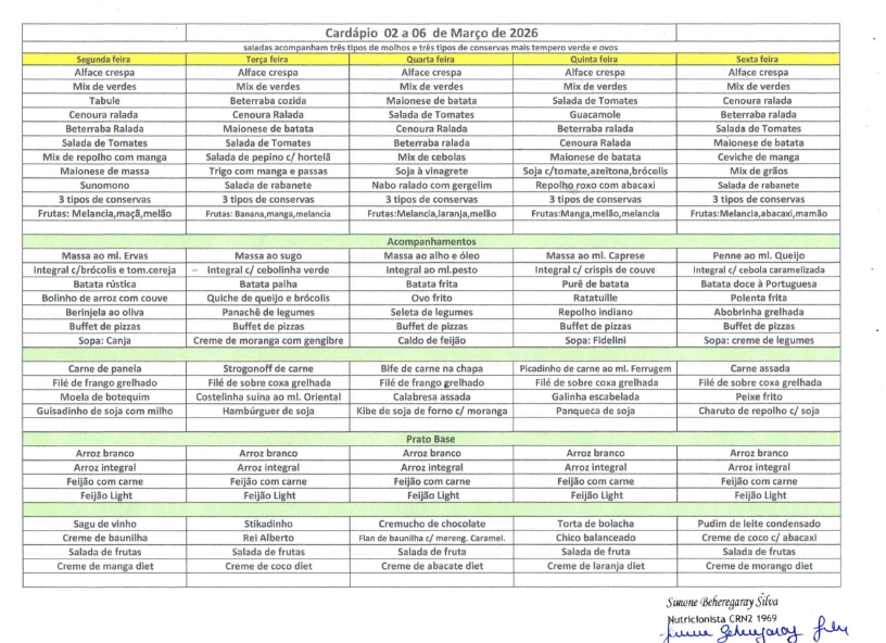Cardápio do Restaurante do CAFF (02/02 a 06/02)